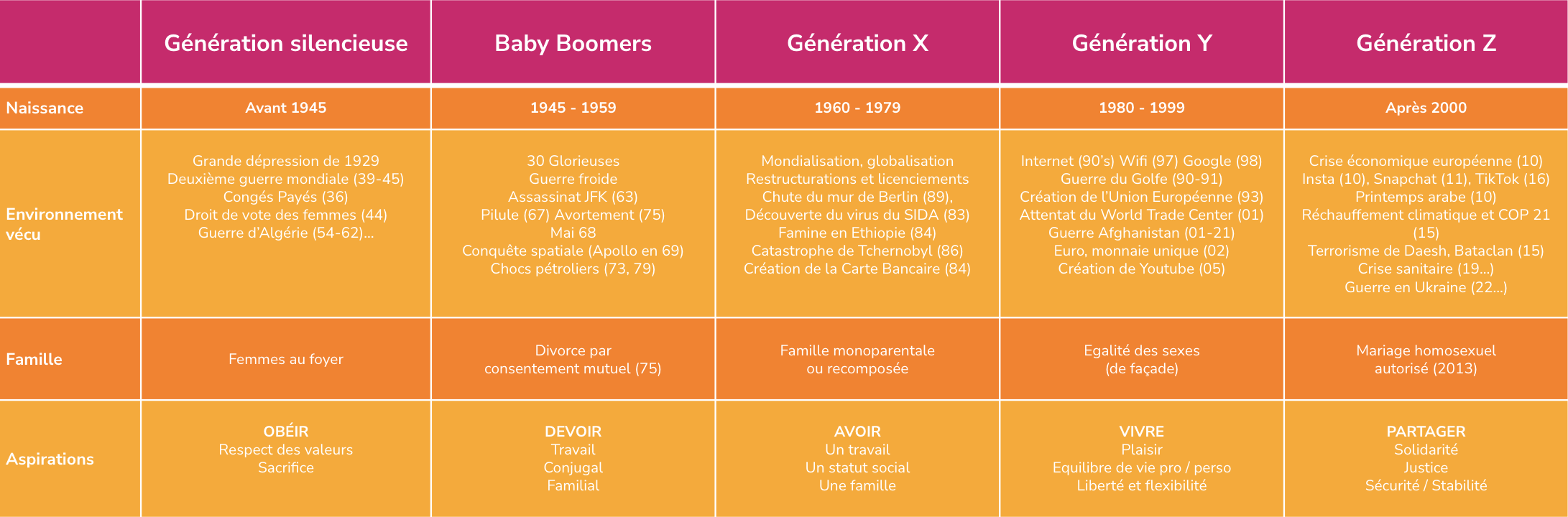 Les frontières entre chaque génération sont souvent floues, mais chacune grandit dans un contexte unique, développant ainsi des codes spécifiques. Comprendre ces contextes est essentiel pour s'ajuster dans la communication et établir des relations de qualité avec eux.